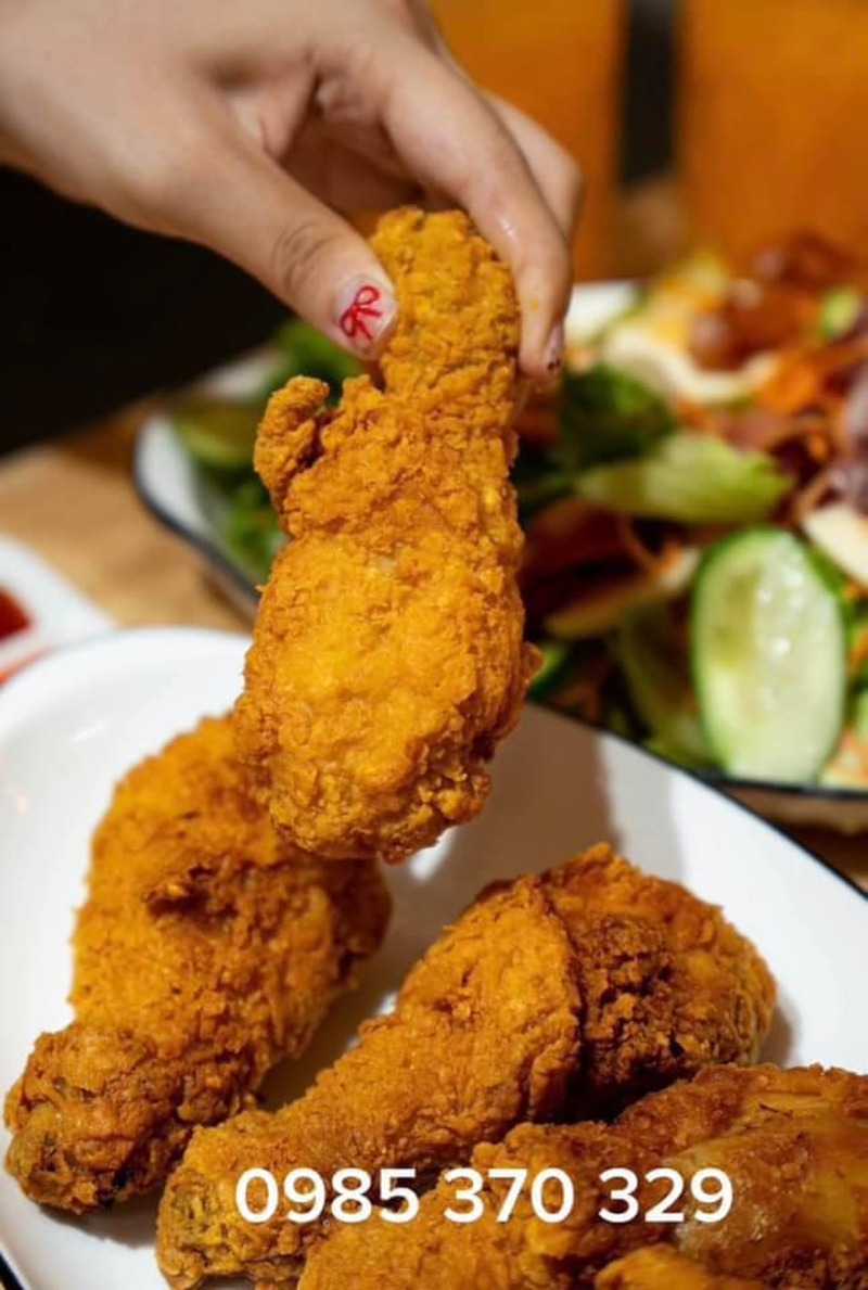- Gà rán giòn: Lớp vỏ vàng ruộm, giòn tan, bên trong thịt gà mềm mọng.